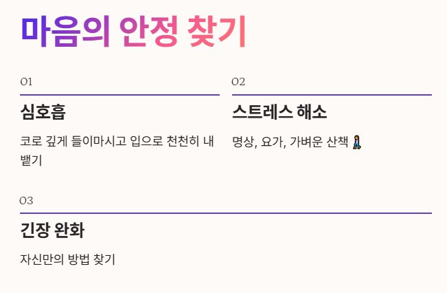 • 명상이나 요가, 가벼운 산책 등 자신만의 스트레스 해소법을 찾는 것이 중요해요. 🚶‍♀️