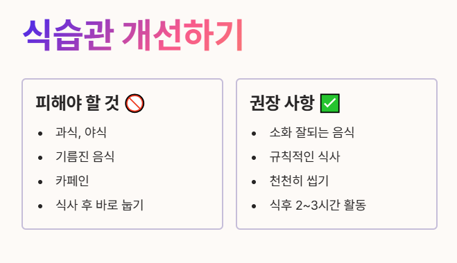 • 역류성 식도염이 원인이라면, 과식, 야식, 기름진 음식, 카페인 섭취를 줄여야 합니다. 🚫