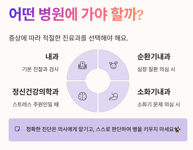 • 만약 심장 질환이 의심된다면 순환기내과, 소화기 문제가 의심된다면 소화기내과, 스트레스가 주된 원인이라면 정신건강의학과의 진료가 필요할 수 있습니다.