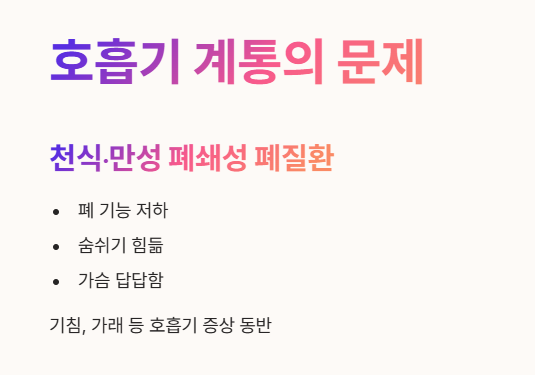 • 천식이나 만성 폐쇄성 폐질환(COPD) 등 폐 기능에 문제가 생기면 숨쉬기가 힘들어지면서 가슴이 답답하게 느껴질 수 있어요.
