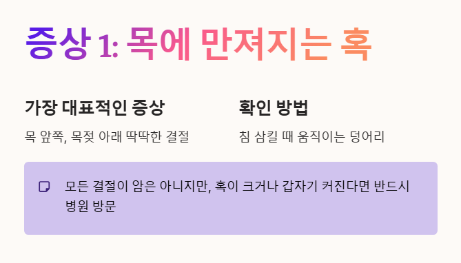 - 통증이 없다고 해서 안심하지 말고, 목에 혹이 만져지거나 목소리 변화 등의 증상이 있다면 즉시 병원을 방문해야 합니다.