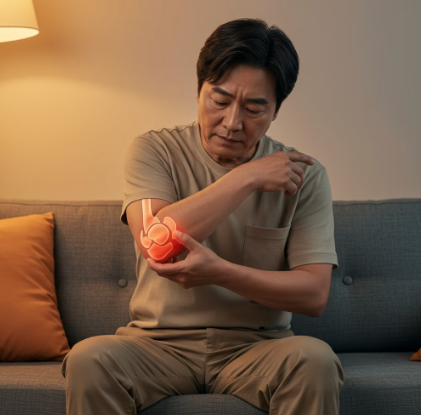 손등, 무릎, 팔꿈치 등 관절 부위나 아킬레스건이 두꺼워지거나 덩어리가 만져질 수 있어요.