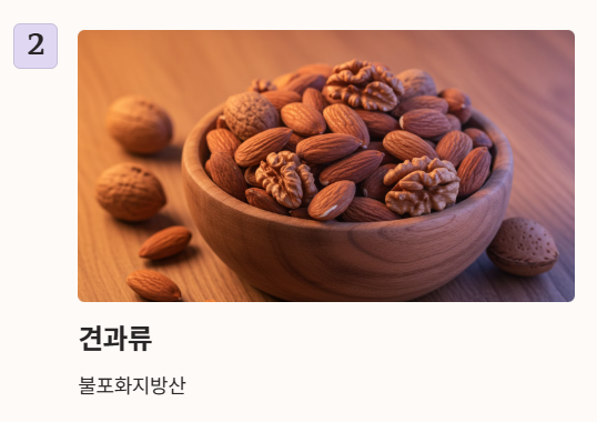 - 등푸른 생선(오메가3), 견과류, 아보카도 같은 불포화지방산이 풍부한 음식이 좋아요. 🥑