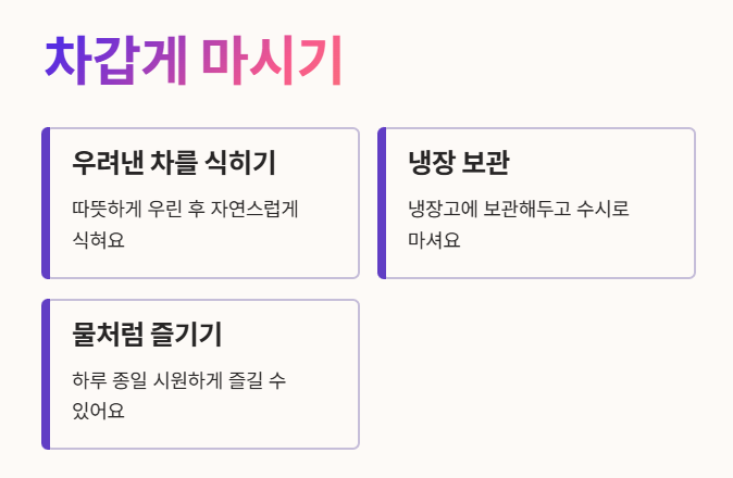 따뜻하게 우려낸 차를 식힌 후 냉장고에 보관해두고 물처럼 수시로 마셔도 좋아요. 💧