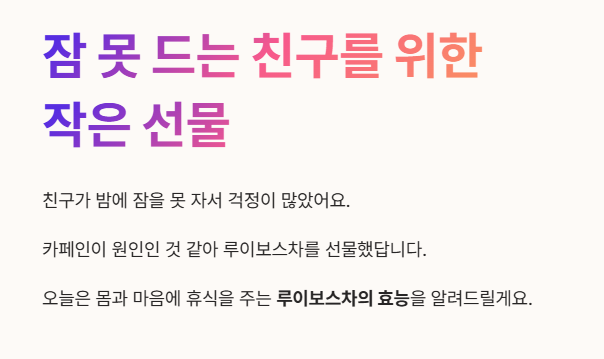 원인이 카페인인 것 같아 커피 대신 마실 만한 차를 찾다가 '루이보스차'를 선물해 줬답니다. ✨