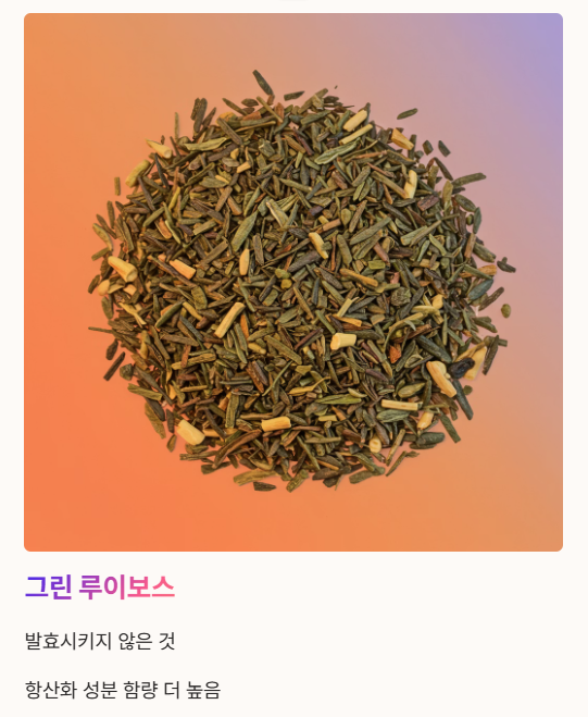 - 그린 루이보스가 발효 과정을 거치지 않아 항산화 성분 함량이 더 높다고 알려져 있습니다.