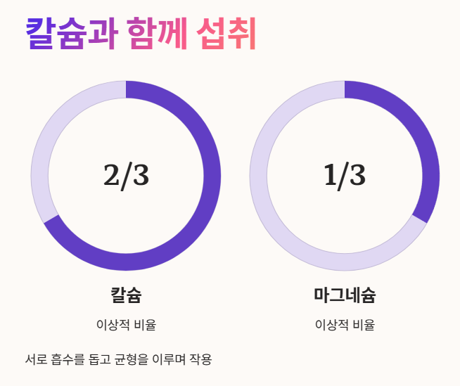 - 보통 칼슘과 마그네슘을 2:1 비율로 섭취하는 것을 이상적으로 봅니다.