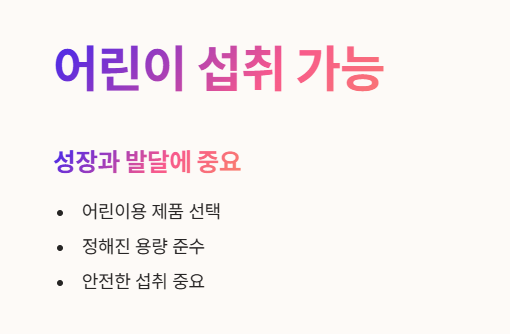 - 하지만 성인과 권장량이 다르므로, 어린이용으로 나온 제품을 정해진 용량에 맞게 먹이는 것이 안전하고 중요합니다.