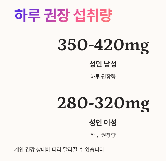- 일반적으로 성인 남성은 하루 350-420mg, 성인 여성은 280-320mg 정도를 권장하고 있어요.