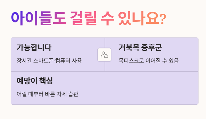 특히 장시간 스마트폰이나 컴퓨터를 사용하는 아이들의 경우 거북목 증후군이 생기기 쉽고, 이는 목디스크로 이어질 수 있어 어릴 때부터 바른 자세 습관을 길러주는 것이 매우 중요합니다.