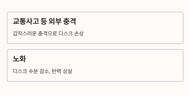 - ⏳ 노화: 나이가 들면서 디스크의 수분이 빠져 탄력을 잃게 돼요.