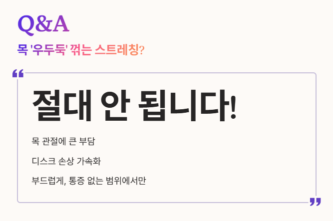 Q1: 목이 뻐근할 때 목을 '우두둑' 꺾는 스트레칭, 괜찮을까요?