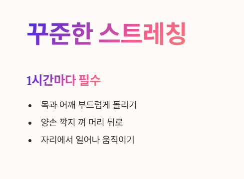 오랜 시간 같은 자세로 있었다면 틈틈이 목과 어깨를 부드럽게 돌려주거나, 양손을 깍지 껴 머리 뒤로 넘기는 등 스트레칭을 해주세요. 1시간에 한 번씩은 꼭 자리에서 일어나 몸을 움직여주는 게 좋아요. 🧘