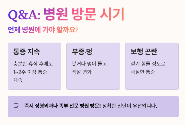 A: 충분히 휴식을 취했는데도 통증이 1~2주 이상 지속되거나, 붓거나 멍이 들고, 걷기 힘들 정도로 통증이 심하다면 즉시 정형외과나 족부 전문 병원을 방문하여 정확한 진단을 받아보는 것이 좋습니다. 👨⚕️