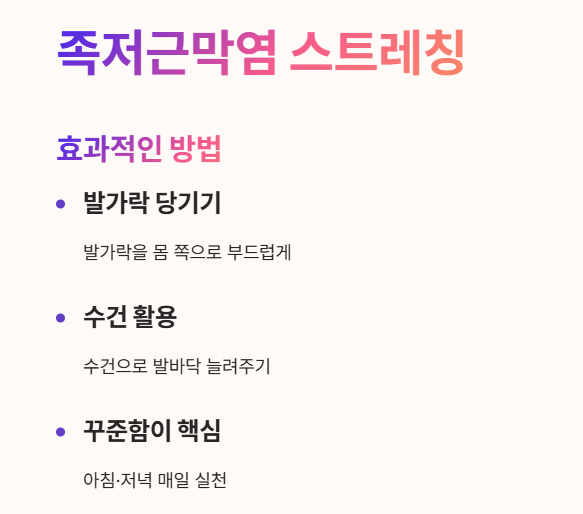 특히 족저근막염의 경우, 경직된 족저근막과 아킬레스건을 늘려주는 스트레칭이 통증 완화와 재발 방지에 매우 효과적입니다.