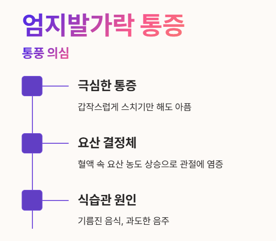 주로 엄지발가락에서 가장 먼저 시작되며, 관절이 빨갛게 부어오르고 열감이 느껴져요.