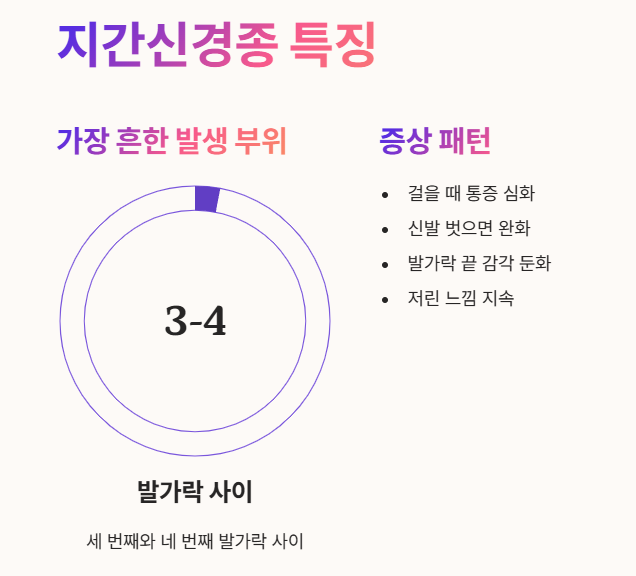 세 번째와 네 번째 발가락 사이에서 가장 흔하게 발생하며, 걸을 때 통증이 심해지고 신발을 벗고 쉬면 괜찮아지는 특징이 있어요.