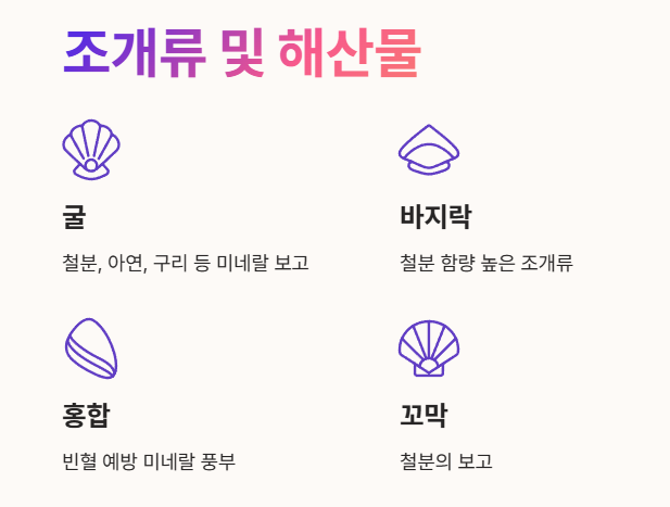 - 굴, 바지락, 홍합, 꼬막 같은 조개류는 철분의 보고예요! 🌊