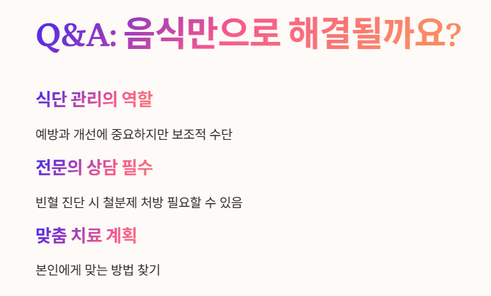 A: 식단 관리는 빈혈 예방과 개선에 매우 중요하지만, 이미 빈혈 진단을 받았다면 의사의 처방에 따라 철분제를 복용하는 것이 필요할 수 있습니다.
