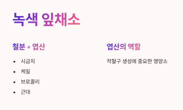 - 엽산 역시 적혈구를 만드는 데 중요한 역할을 하는 영양소랍니다. 🥬