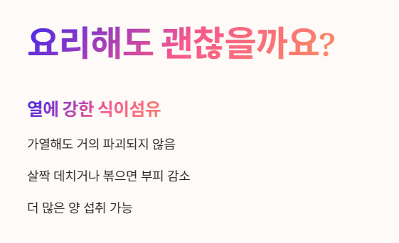 • 아니요, 식이섬유는 열에 강해서 가열해도 거의 파괴되지 않아요.