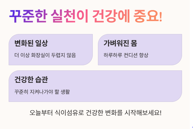 식이섬유 섭취는 단기간의 이벤트가 아니라, 꾸준히 지켜나가야 할 건강한 습관이랍니다. 🏃‍♂️