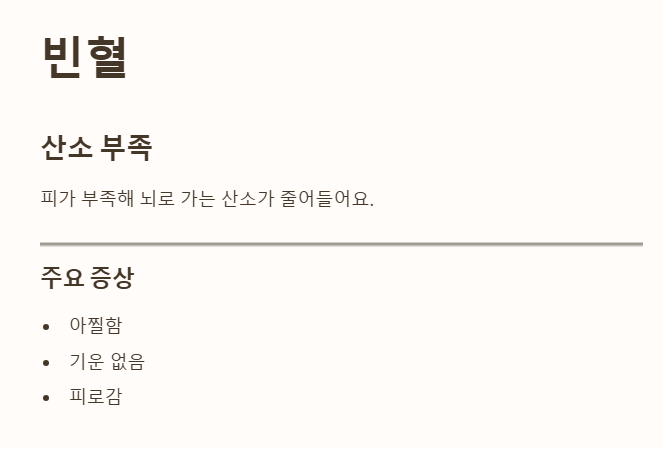 - 몸에 산소를 운반하는 피가 부족해 뇌로 가는 산소가 줄어들면 어지러울 수 있어요.