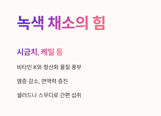 - 비타민 K와 항산화 물질이 풍부해 염증을 줄이고 면역력을 높여줘요.