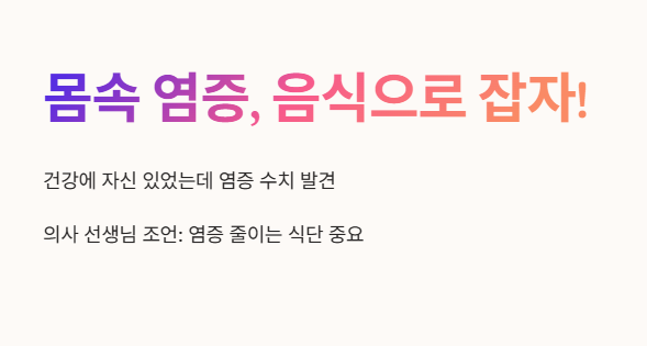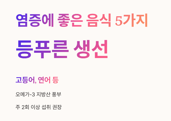 이 영양소들이 풍부한 음식을 챙겨 먹는 것만으로도 염증 관리에 큰 도움이 된답니다.