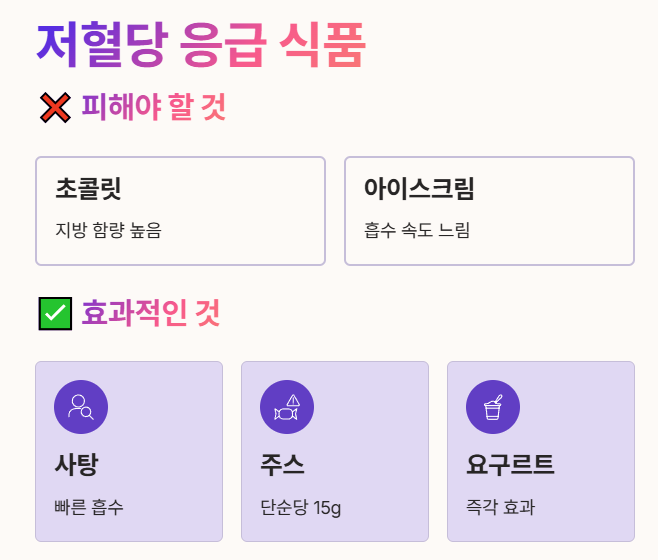 • 저혈당 응급 상황에서는 사탕, 주스, 요구르트처럼 흡수가 빠른 단순당 식품을 15g 정도 섭취하는 것이 가장 효과적입니다.