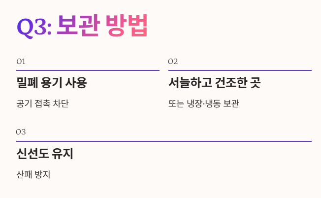 - 반드시 밀폐 용기에 담아 서늘하고 건조한 곳에 보관하거나, 냉장 또는 냉동 보관하는 것이 신선함을 오래 유지하는 가장 좋은 방법입니다.