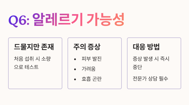 - 처음 먹어보는 경우 소량만 섭취해보고, 피부 발진, 가려움, 호흡 곤란 등의 증상이 나타나면 즉시 섭취를 중단하고 전문가와 상담해야 합니다.